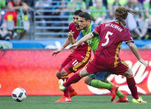 Seattle Sounders midfielder Cristian Roldan, center, pushes forward against Real Salt Lake midfielders Javier Morales (11) and Kyle Beckerman during the second half of an MLS soccer match Sunday, Aug. 14, 2016, in Seattle. (Lindsay Wasson/The Seattle Times via AP) The Associated Press