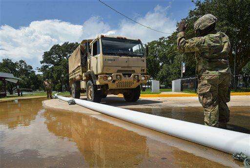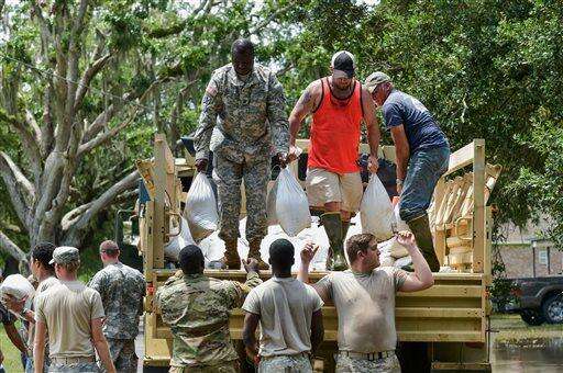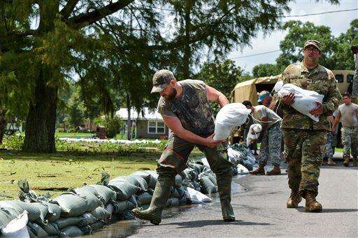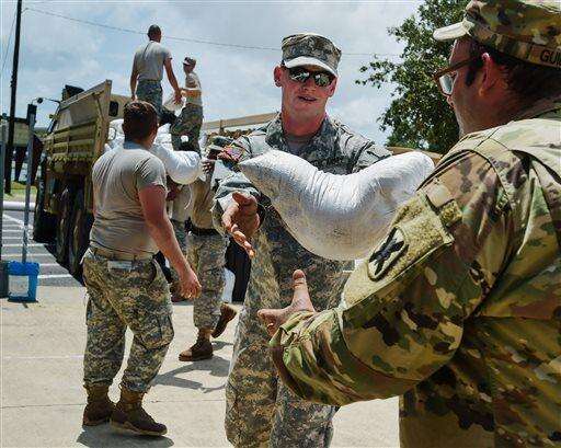 Members of the Louisiana Army National Guard help place sandbags to protect the city hall in Lake Arthur, La., Wednesday, Aug. 17, 2016. (Scott Clause/The Daily Advertiser via AP)