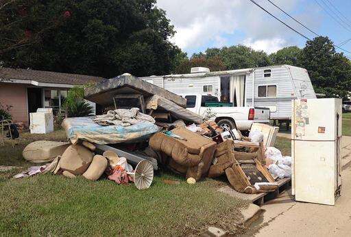 A growing pile of debris sits outside the flood-ravaged home of Carolyn and James Smith in Denham Springs, La. on Wednesday, Aug 17, 2016. Smith says she and four other adults will live for the time being in the travel trailer that one of her sons towed to the driveway after weekend flooding inundated the area. (AP Photo/Kevin McGill)