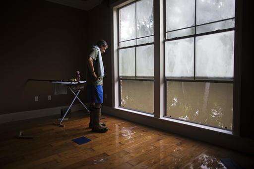 David Key looks at water out of his master bedroom windows in his flooded home in Prairieville, La., Tuesday, Aug. 16, 2016. Key, an insurance adjuster, fled his home as the flood water was rising with his wife and three children and returned today to assess the damage. (AP Photo/Max Becherer)