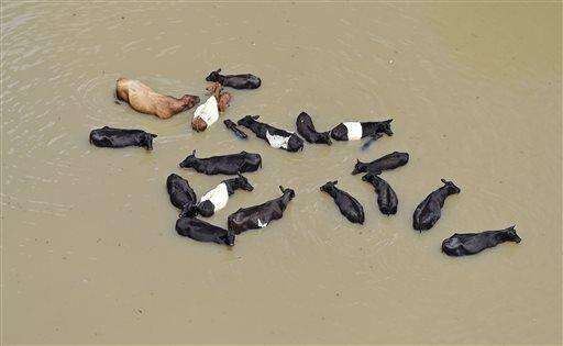 Cattle huddles together in the water, caused by flooding after the heavy rains in Ascension Parish, in St. Amant, south of Baton Rouge, La., Tuesday, Aug. 16, 2016. (Bill Feig/The Advocate via AP)
