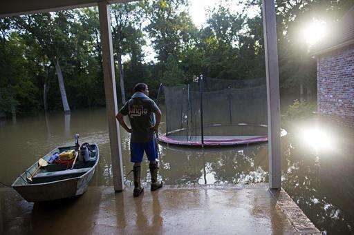 David Key looks at the back yard of his flooded home in Prairieville, La., Tuesday, Aug. 16, 2016. Key, an insurance adjuster, fled his home as the flood water was rising with his wife and three children and returned today to assess the damage. (AP Photo/Max Becherer)
