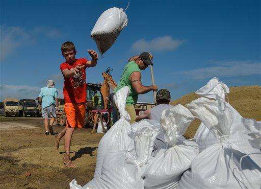 Lake Arthur, La., residents receive help from the Army National Guard to build sand bag wall to keep flood waters from the city on Wednesday, Aug. 17, 2016. (Scott Clause/The Daily Advertiser via AP)