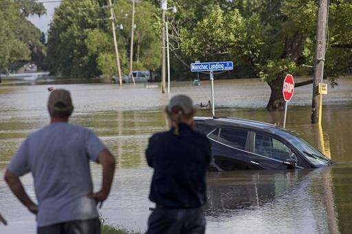 Residents survey the flood water on Old Jefferson Highway at Bayou Manchac in Prairieville, La., Tuesday, Aug. 16, 2016. Rivers and creeks were still dangerously bloated in areas south of Baton Rouge as people filled sandbags there to protect their houses, bracing for the worst as the water worked its way south. In one area, Ascension Parish, officials said some small towns have already been inundated. (AP Photo/Max Becherer)