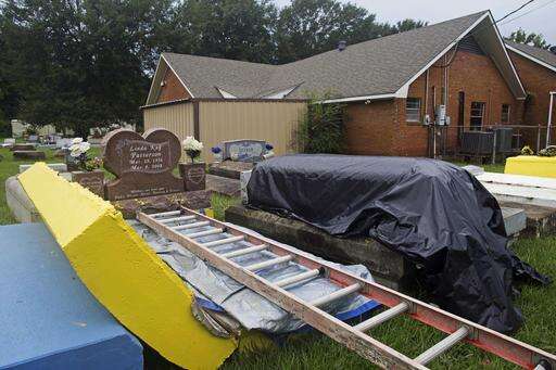 A flood damaged tomb is covered for repair at the cemetery of Greater St. Mark Baptist Church in Walker, La., Tuesday, Aug. 16, 2016. Authorities went door to door and car to car to check for bodies Tuesday, and homeowners began the heartbreaking task of gathering up soaked family photos and mucking out houses dank with bayou mud, as the floodwaters started to recede across parts of southern Louisiana. (AP Photo/Max Becherer)
