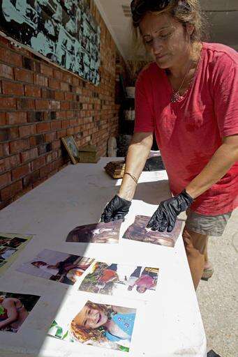 Daniella Letelier puts wet family photos out to dry as she cleans her flood damaged home in Baton Rouge, La., Tuesday, Aug. 16, 2016. Letelier had more than five feet of water in her home. At least 40,000 homes were damaged and eight people killed in the historic Louisiana floods, the governor said Tuesday, giving a stark assessment of the widespread disaster. (AP Photo/Max Becherer)