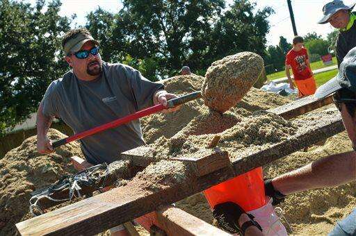 Brock Thibodeaux along with volunteers continue to fill sand bags to stop flood waters from rising in Lake Arthur, La., Wednesday, Aug. 17, 2016. (Scott Clause/The Daily Advertiser via AP)