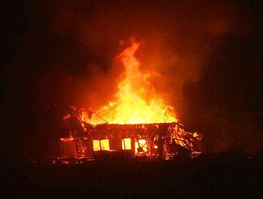 LOS ANGELES (AP) - What began as a small brush fire along a freeway in drought-stricken Southern California morphed into a massive blaze fueled by gusty winds and dry vegetation. Swift-moving flames gutted a historic Route 66 diner, burned homes to their foundations and forced tens of thousands of people to flee the Cajon Pass, a mountain pass between the San Bernardino Mountains and the San Gabriel Mountains.