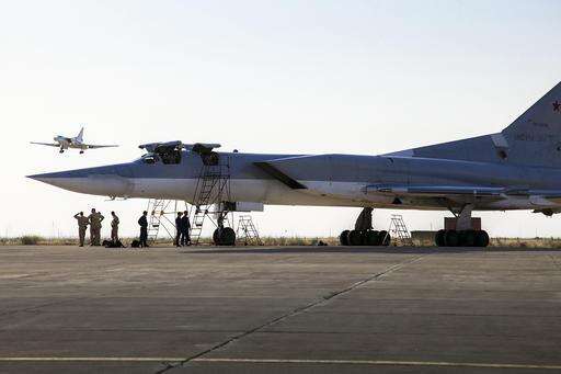 In this frame grab provided by Russian Defence Ministry press service, Russian long range bomber Tu-22M3 flies during an air strike over Aleppo region of Syria on Tuesday, Aug. 16, 2016. Russia's Defense Ministry said on Tuesday Russian warplanes have taken off from a base in Iran to target Islamic State fighters in Syria. (Russian Defence Ministry Press Service photo via AP) The Associated Press