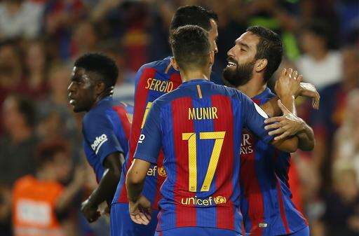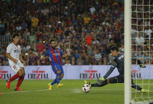 BARCELONA, Spain (AP) - Arda Turan scored two goals before Lionel Messi added a third as Barcelona beat Sevilla 3-0 on Wednesday to win the Spanish Super Cup with a 5-0 victory on aggregate.