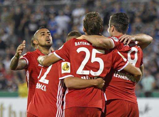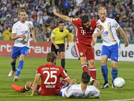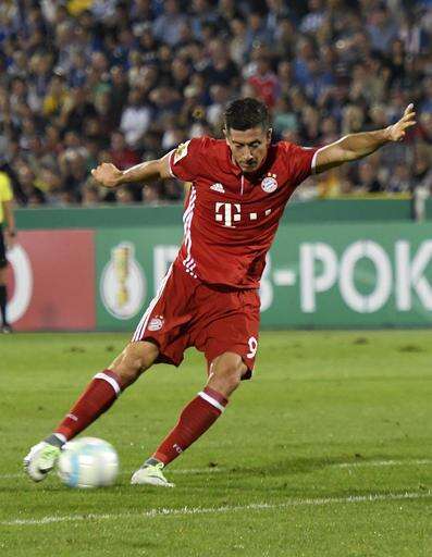 BERLIN (AP) - Robert Lewandowski scored a hat trick Friday as Bayern Munich began its German Cup defense with a comfortable 5-0 win at fourth-tier side Carl Zeiss Jena.