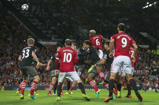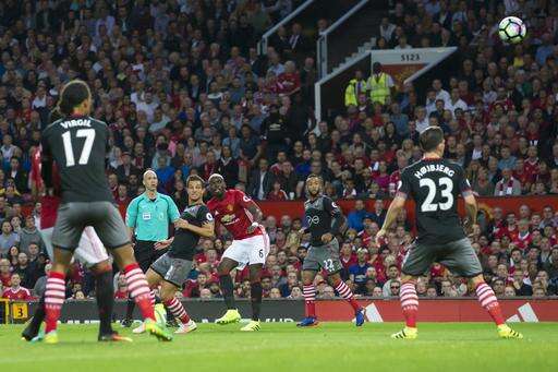 Manchester United's Paul Pogba, upper centre right, heads athe ball at goal, during the English Premier League soccer match between Manchester United and Southampton at Old Trafford Stadium, Manchester, England, Friday, Aug. 19, 2016. (AP Photo/Jon Super)