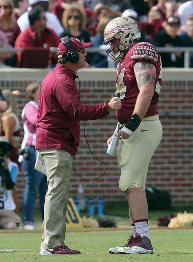 File- This Nov. 14, 2015, file photo shows Florida State's head coach Jimbo Fisher having a discussion with center Alec Eberle during a time out against North Carolina State's in the second quarter of an NCAA college football game, Saturday, Nov. 14, 2015 in Tallahassee, Fla. Offensive line coach Rick Trickett has a bounty of linemen to work with as Florida State goes through preseason practices. Finding the right combination for the Sept. 5 opener in Orlando against Mississippi might be a tougher task. (AP Photo/Steve Cannon, File) The Associated Press