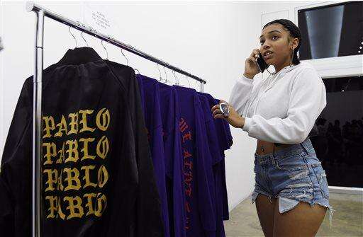 Josie Arias, of Los Angeles, talks on her phone as she inspects a rack of clothes at Kanye West's "Pablo" pop-up shop on Friday, Aug. 19, 2016, in Los Angeles. The rapper-turned-fashion mogul announced plans to open 21 stores worldwide just for this weekend to sell clothing based on his latest album, "The Life of Pablo." (Photo by Chris Pizzello/Invision/AP) The Associated Press