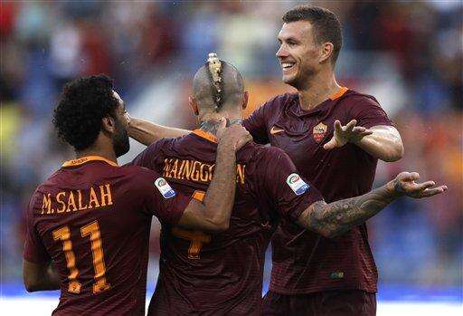 Roma’s Edin Dzeko, right, celebrates with his teammates Radja Nainggolan and Mohamed Salah, left, after scoring his side's third goal, during a Serie A soccer match between Roma and Udinese, at Rome's Olympic stadium, Saturday, Aug. 20, 2016. (AP Photo/Alessandra Tarantino) The Associated Press