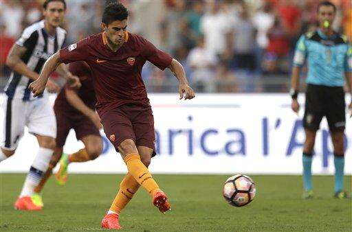 Roma’s Diego Perotti scores on a penalty his side's second goal, during a Serie A soccer match between Roma and Udinese, at Rome's Olympic stadium, Saturday, Aug. 20, 2016. (AP Photo/Alessandra Tarantino) The Associated Press