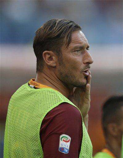 Roma’s Francesco Totti, left, reacts after his Diego Perotti scored his side's second goal during a Serie A soccer match between Roma and Udinese, at Rome's Olympic stadium, Saturday, Aug. 20, 2016. (AP Photo/Alessandra Tarantino) The Associated Press
