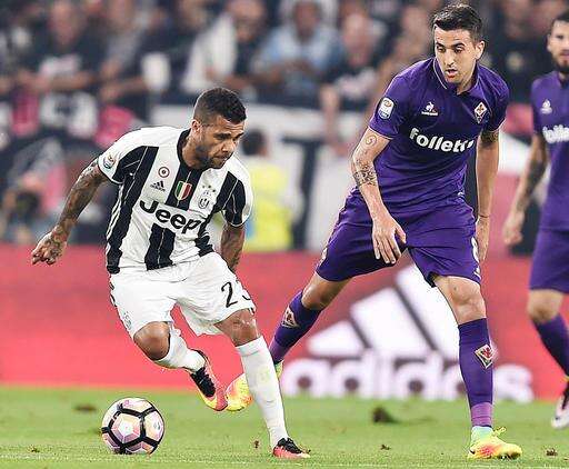 Juventus' Dani Alves, left, gets the ball past Fiorentina's Matia Vecino during a Serie A soccer match, at Turin's Juventus Stadium, Saturday, Aug. 20, 2016. (Alessandro Di Marco/ANSA via AP) The Associated Press