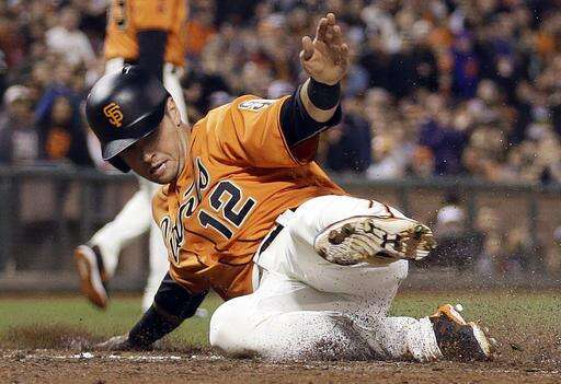 San Francisco Giants' Joe Panik slides to score against the New York Mets in the third inning of a baseball game Friday, Aug. 19, 2016, in San Francisco. Panik scored on a single by Denard Span. (AP Photo/Ben Margot) The Associated Press
