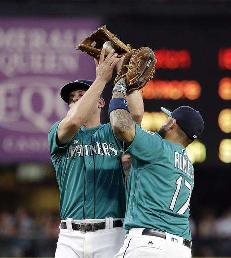 Seattle Mariners third baseman Kyle Seager, left, and first baseman Stefen Romero collide as Seager catches a pop-up from Milwaukee Brewers' Ryan Braun during the fourth inning of a baseball game Friday, Aug. 19, 2016, in Seattle. (AP Photo/Elaine Thompson) The Associated Press