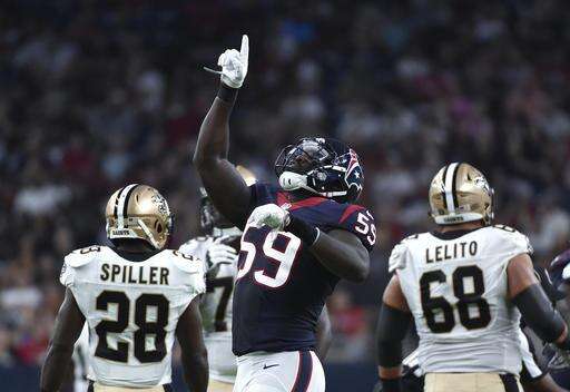 New Orleans' pass protection, on the other hand, kept Drew Brees and backup quarterback Luke McCown on the run for much of the game. Brees was sacked by Jadeveon Clowney for a 14-yard loss in the second quarter. Houston's pressure came without J.J. Watt, who is still recovering from back surgery, but hopes to return near the start of the season.