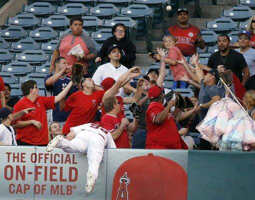 Los Angeles Angels right fielder Kole Calhoun tumbles over the wall, unable to reach a solo home run by New York Yankees' Jacoby Ellsbury during the first inning of a baseball game in Anaheim, Calif., Friday, Aug. 19, 2016. (AP Photo/Reed Saxon) The Associated Press