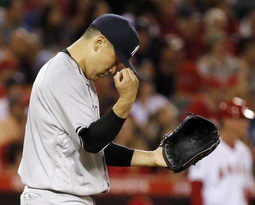 New York Yankees pitcher Masahiro Tanaka, of Japan, reacts after a long fly ball to center field by Los Angeles Angels' Kole Calhoun was caught during the fourth inning of a baseball game in Anaheim, Calif., Friday, Aug. 19, 2016. (AP Photo/Reed Saxon) The Associated Press