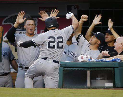 New York Yankees celebrate Jacoby Ellsbury's solo home run against the Los Angeles Angels during the first inning of a baseball game in Anaheim, Calif., Friday, Aug. 19, 2016. (AP Photo/Reed Saxon) The Associated Press