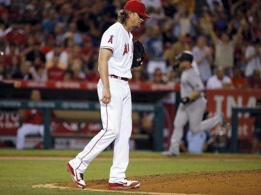 Los Angeles Angels starting pitcher Jared Weaver walks to the mound as New York Yankees' Brian McCann circles the bases on a home run during the fifth inning of a baseball game in Anaheim, Calif., Friday, Aug. 19, 2016. Weaver was pulled from the game after the home run. (AP Photo/Reed Saxon) The Associated Press