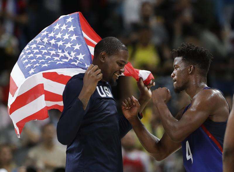 The United States' Kevin Durant left, and Jimmy Butler celebrate winning men's basketball gold over Serbia on Sunday at the Rio Olympics. Associated Press