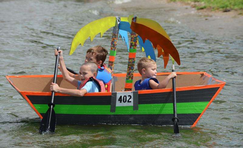 From left, Hunter Dudoit, 7, of Streamwood, Lann Tarrant, 5, of Wauconda and his brother, Rylan, 3, pilot their boat Sunday during the 19th annual Cardboard Race at Lakefront Park in Fox Lake. Joe Lewnard/jlewnard@dailyherald.com