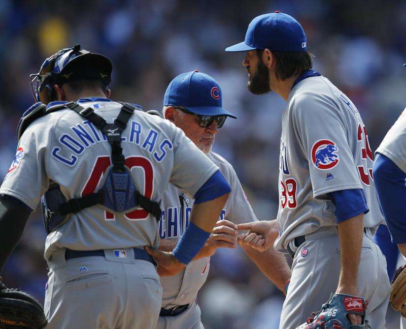 Cubs manager Joe Maddon, center, takes the ball from starting pitcher Jason Hammel in the fourth inning of Sunday's loss in Denver. Associated Press