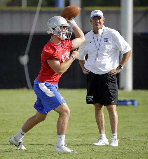 FILE -- In this Aug. 7, 2015, photo, Middle Tennessee head coach Rick Stockstill watches as his son, quarterback Brent Stockstill, throws during NCAA college football practice in Murfreesboro, Tenn. The father-son combination gives the Blue Raiders plenty of reason for optimism. (AP Photo/Mark Humphrey, File) The Associated Press
