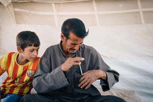 In this August 17, 2016 photo, Jarjis Muhammad Hajaj, sits next to his son outside their tent at the Dibaga Camp for displaced people, as he demonstrates the way he once tried to hide a cigarette in his front pocket while living under Islamic State rule in his hometown of Hajj Ali, northern Iraq. As the Islamic State group loses ground in Iraq, the militants are showing strains in their rule over areas they still control, growing more brutal, killing deserters and relying on younger recruits, according to residents. The accounts pointed to the difficulties the extremist group is facing as Iraqi forces backed by the United States prepare for an assault on Mosul. (AP Photo/Alice Martins) The Associated Press