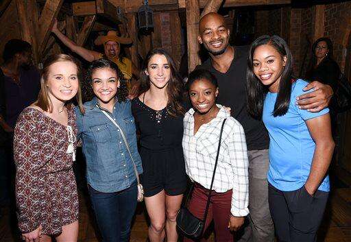 Members of the "Final Five" Rio Olympics gold medal-winning U.S. Gymnastics team, from left, Simone Biles, Madison Kocian, Gabby Douglas, Laurie Hernandez and Aly Raisman pose with "Hamilton" star Javier Muñoz after attending the performance at the Richard Rogers Theatre on Tuesday, Aug. 23, 2016, in New York. (Photo by Evan Agostini/Invision/AP)