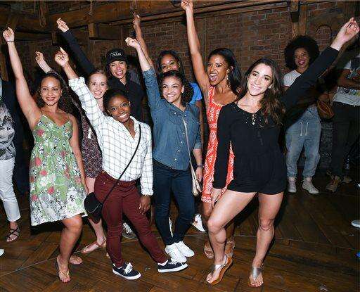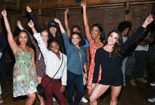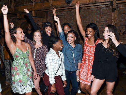 Members of the "Final Five" Rio Olympics gold medal-winning U.S. Gymnastics team visit backstage with the cast of "Hamilton" after attending the performance at the Richard Rogers Theatre on Tuesday, Aug. 23, 2016, in New York. (Photo by Evan Agostini/Invision/AP)