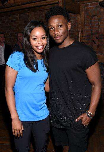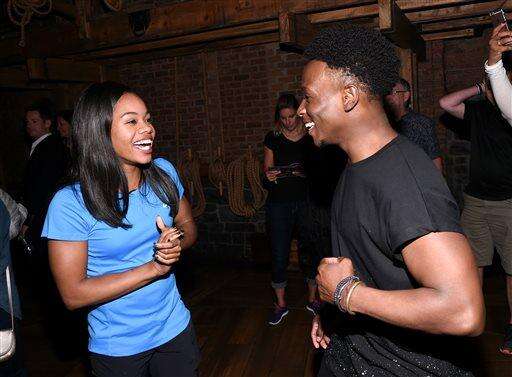 U.S. Gymnastics gold medalist Gabby Douglas, left, poses with "Hamilton" cast member Gregory Haney backstage after attending the performance at the Richard Rogers Theatre on Tuesday, Aug. 23, 2016, in New York. (Photo by Evan Agostini/Invision/AP)