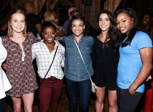 Members of the "Final Five" Rio Olympics gold medal-winning U.S. Gymnastics team, clockwise from left, Simone Biles, Madison Kocian, Gabby Douglas, Laurie Hernandez and Aly Raisman chat with "Hamilton" star Javier Muñoz after attending the performance at the Richard Rogers Theatre on Tuesday, Aug. 23, 2016, in New York. (Photo by Evan Agostini/Invision/AP)