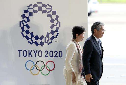 Tokyo Gov. Yuriko Koike, second from right, and Tsunekazu Takeda, president of the Japanese Olympic Committee, walk past the logo of the Tokyo 2020 Olympics during the Olympic flag arrival ceremony at Haneda international airport in Tokyo, Wednesday, Aug. 24, 2016. The Olympic flag arrived in Tokyo, host of the next Summer Games. (AP Photo/Eugene Hoshiko)