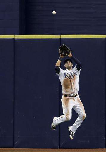 Tampa Bay Rays center fielder Kevin Kiermaier makes a leaping catch on a fly out by Boston Red Sox's Sandy Leon during the ninth inning of a baseball game Tuesday, Aug. 23, 2016, in St. Petersburg, Fla. (AP Photo/Chris O'Meara) The Associated Press