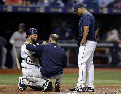 Tampa Bay Rays trainer Ron Porterfield, center, looks at catcher Bobby Wilson, left, during the fourth inning of a baseball game against the Boston Red Sox on Tuesday, Aug. 23, 2016, in St. Petersburg, Fla. Looking on is manager Kevin Cash. Wilson was able to stay in the game. (AP Photo/Chris O'Meara) The Associated Press