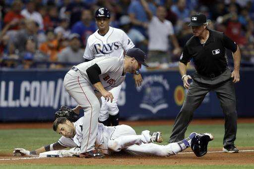 Boston Red Sox third baseman Travis Shaw tags out Tampa Bay Rays' Kevin Kiermaier at third base during the eighth inning of a baseball game Tuesday, Aug. 23, 2016, in St. Petersburg, Fla. Kiermaier was out trying to stretch a double into a triple. Making the call is Paul Nauert. (AP Photo/Chris O'Meara) The Associated Press