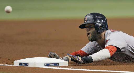 Boston Red Sox's Dustin Pedroia slides into third base ahead of the throw to Tampa Bay Rays' Evan Longoria during the first inning of a baseball game Tuesday, Aug. 23, 2016, in St. Petersburg, Fla. Pedroia tagged up form second base on a flyout by David Ortiz. (AP Photo/Chris O'Meara) The Associated Press