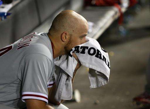 Philadelphia Phillies starting pitcher Jake Thompson wipes his face in the dugout after the fifth inning of an interleague baseball game against the Chicago White Sox on Tuesday, Aug. 23, 2016, in Chicago. (AP Photo/Charles Rex Arbogast) The Associated Press
