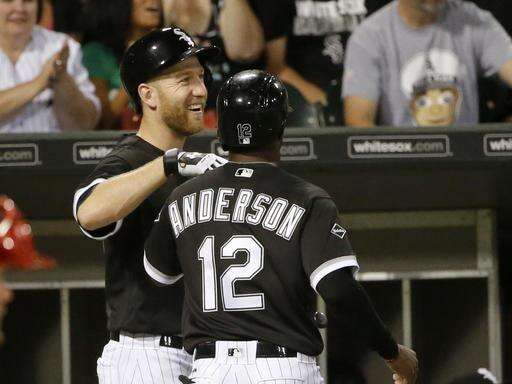 Chicago White Sox's Todd Frazier, left, greets Tim Anderson outside the dugout after Anderson scored on a single by Jose Abreu during the third inning of an interleague baseball game against the Philadelphia Phillies on Tuesday, Aug. 23, 2016, in Chicago. (AP Photo/Charles Rex Arbogast) The Associated Press