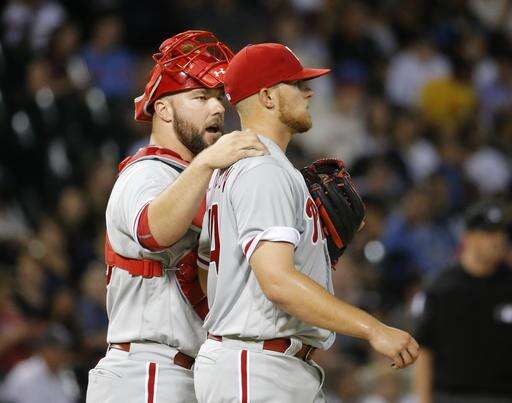 Philadelphia Phillies catcher Cameron Rupp, left, talks to starting pitcher Jake Thompson during the third inning of an interleague baseball game against the Chicago White Sox on Tuesday, Aug. 23, 2016, in Chicago. (AP Photo/Charles Rex Arbogast) The Associated Press