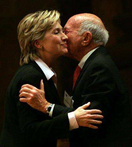 FILE - In this Jan. 18, 2006 file photo, then-Sen. Hillary Rodham Clinton, D-N.Y., is greeted by S. Daniel Abraham at Princeton University in Princeton, N.J. More than half the people outside the government who met with Hillary Clinton while she was secretary of state gave money, either personally or through companies or groups, to the Clinton Foundation. It's an extraordinary proportion indicating her possible ethics challenges if elected president. (AP Photo/ Jose F. Moreno, File) The Associated Press