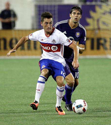 Toronto FC's Jay Chapman, left, looks to pass the ball as he is defended by Orlando City's Kaka during the first half of an MLS soccer game, Wednesday, Aug. 24, 2016, in Orlando, Fla. (AP Photo/John Raoux)