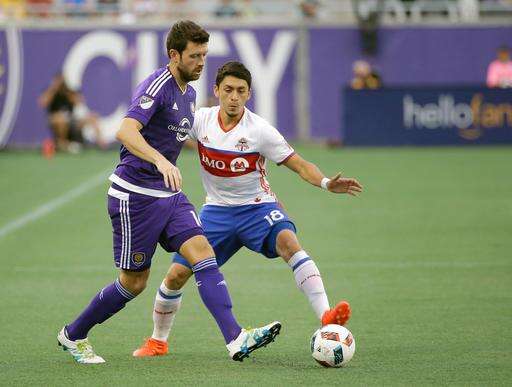 Orlando City's Luke Boden, left, and Toronto FC's Marco Delgado (18) fight for control of the ball during the first half of an MLS soccer game, Wednesday, Aug. 24, 2016, in Orlando, Fla. (AP Photo/John Raoux)