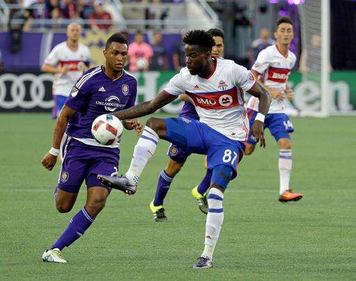 Toronto FC's Tosaint Ricketts (87) moves the ball past Orlando City's Tommy Redding, left, during the first half of an MLS soccer game, Wednesday, Aug. 24, 2016, in Orlando, Fla. (AP Photo/John Raoux)